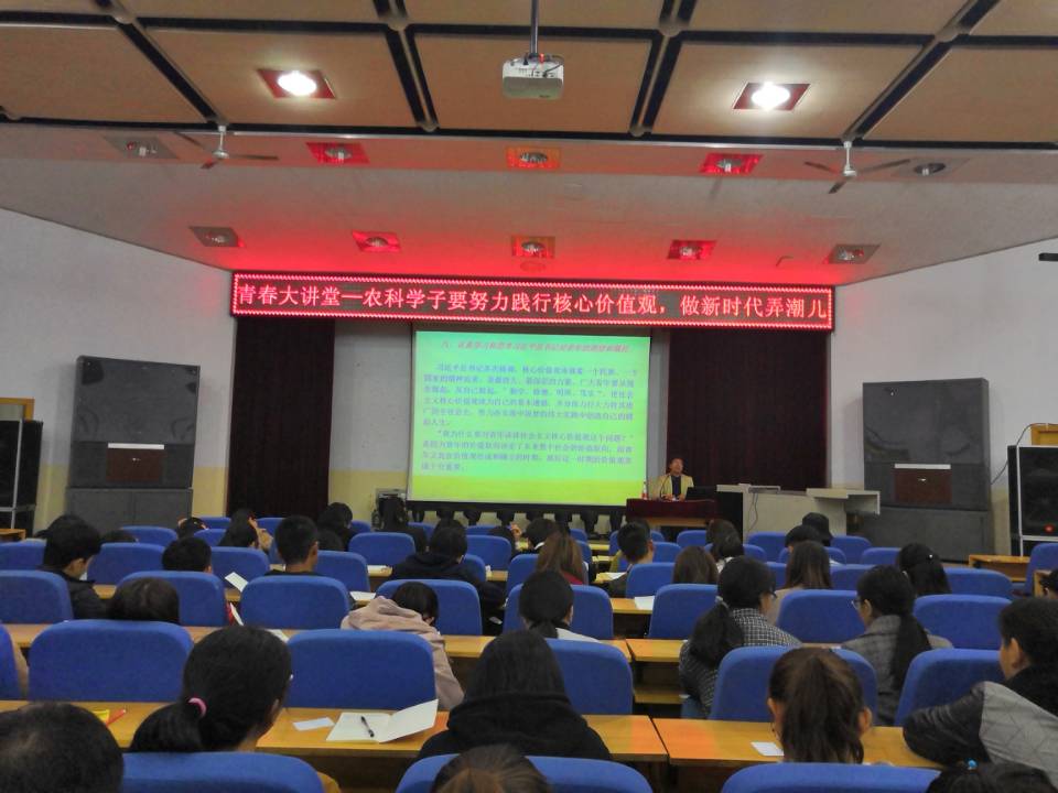 2018年10月22日晚,kaiyun官方登录入口举办了《农科学子要努力践行核心价值观,做新时代弄潮儿》的青春大讲堂专题讲座,学院党委负责人作了专题报告。 150名青年学生参加了活动。